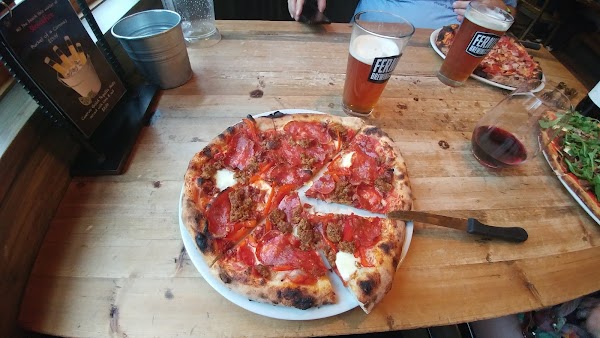 Very friendly service! Love their patio for sitting outside enjoying some drinks with friends, but the pizza is not exactly my preference. My partner didn't enjoy it very much either, but maybe we just don't like the burnt taste unique to a wood oven pizza ????♀️ My favourite part was the hot sauce to drench it with! ????